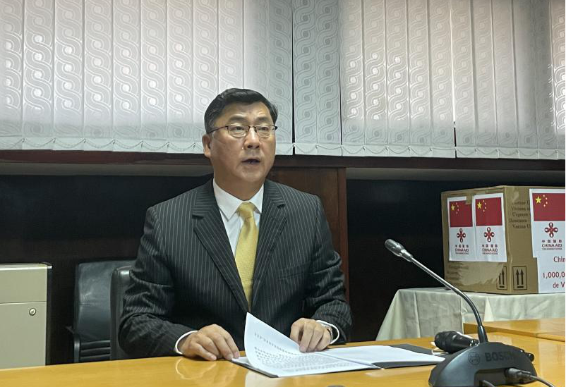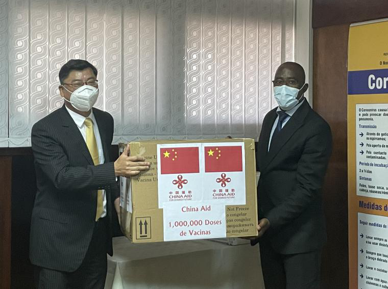 12月13日,中国驻莫桑比克大使王贺军与莫卫生部长蒂亚戈共同出席中国政府援助莫政府新一批100万剂疫苗交接仪式,并签署交接证书。
